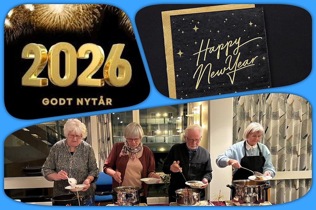 Nytårsfesten 2026 var en aften med god mad og sang fra højskolesangbogen. Det vil sige det blev med teksterne på skærmen, da sangbøgerne blev brugt ovre i kirken. Vi fik Svend dejlige suppe og Lisbeths fine suppebrød. Jens Rasmussen fra Dronninglund ledede sangtimen, hvor vi sang, kendte, mindre kendt og helt ukendte sange. Dejligt at hvile i de kendte; men også rigtig godt og spændende at prøve kræfter med de ny sange i højskolesangbogen. Efter kaffe/te hjemmebagt kringle og julesmåkager havde vi som sædvanligt meddelelser. Afslutningen hed “med hjertet” som handlede om at være til stede i nuet med hjertet - opmærksom, hjælpende og lyttende. Vi blev sendt hjem med et "GODT NYTÅR".